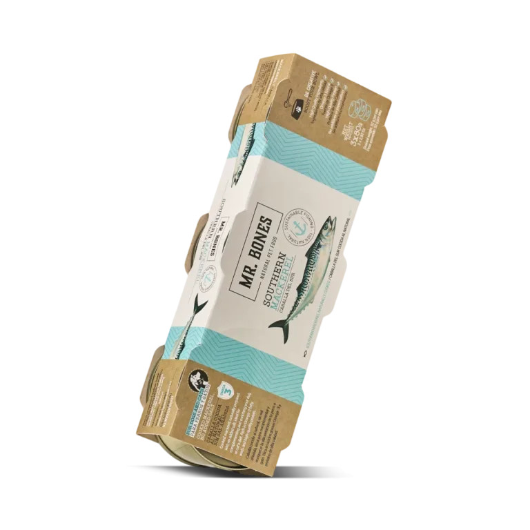 Kiegészítő konzerveledel kutyáknak és macskáknak, természetes, déli eredetű főtt makrélából, hozzáadott só nélkül.